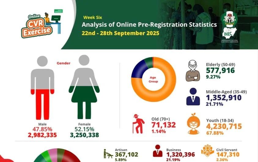 The Independent National Electoral Commission (INEC) has recorded 6,2 online pre-registrations in its ongoing nationwide Continuous Voter Registration (CVR), with in-person registration hitting over one million as of 28 September.