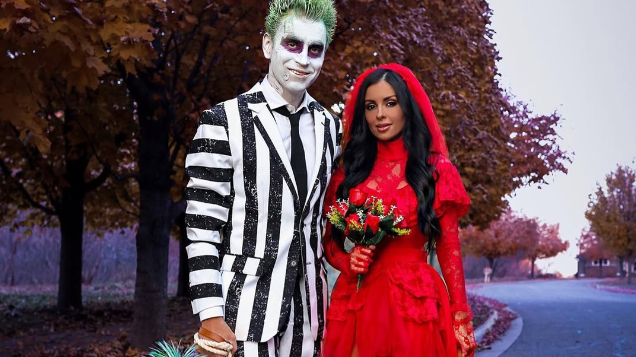 For couples ready to go full horror, Chucky and Tiffany are the ultimate fright-filled duo. Chucky’s signature overalls and striped shirt are easy to source, while Tiffany’s look can be recreated with thrifted pieces for a DIY touch. Together, this pairing balances scares and playful fun, making it a standout couples’ costume for Halloween.