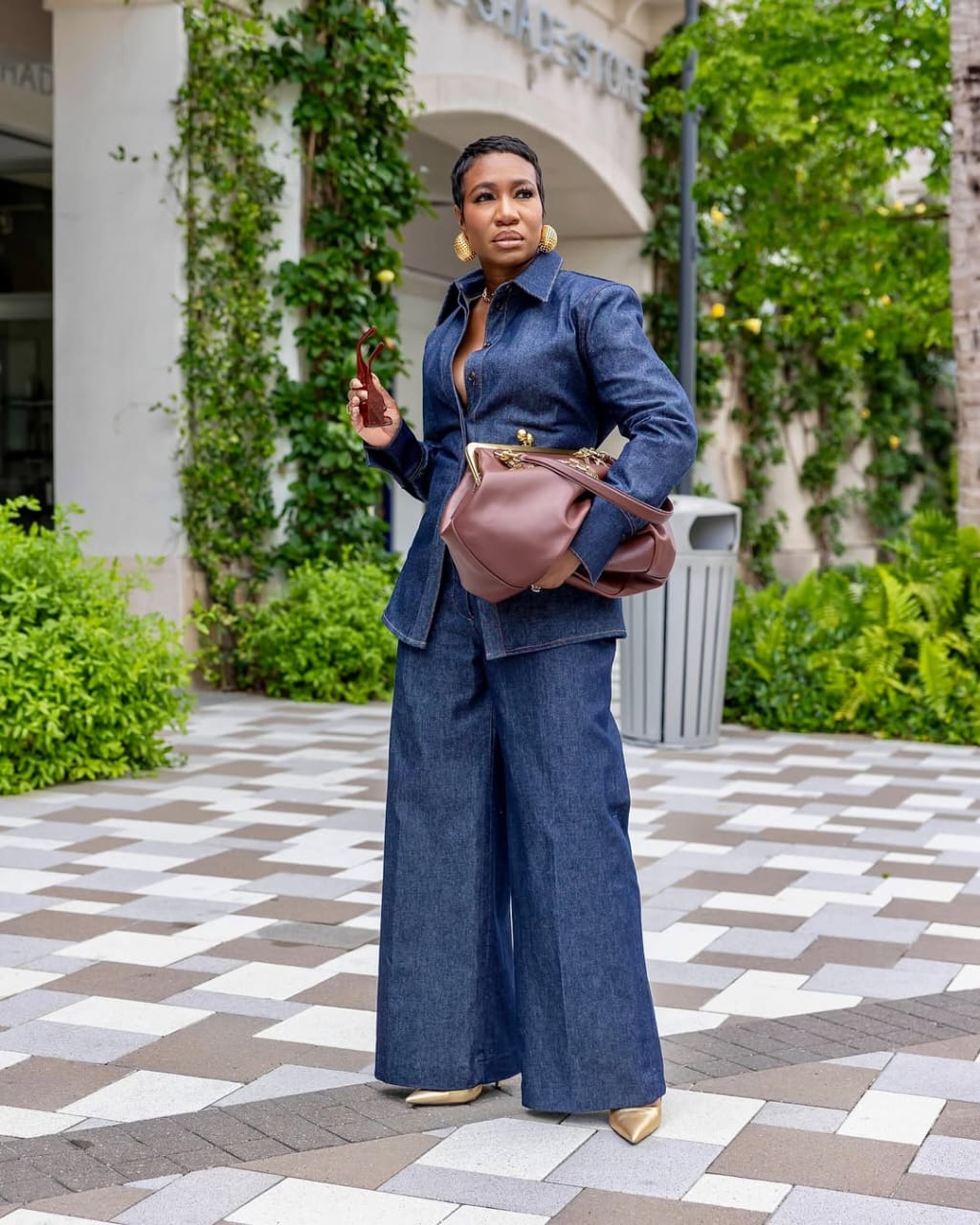 Denim on denim is the kind of classic that always delivers. Pair a simple denim shirt with your favorite wide-leg jeans, then anchor the look with a sleek leather tote bag. The result is clean, coordinated, and effortlessly fun. The tote adds just the right dose of maturity, transforming a casual staple into a polished statement. It’s the look you reach for when you want to appear put-together without looking like you tried too hard. Finish with loafers or kitten heels to keep the vibe cool, relaxed, and undeniably chic.