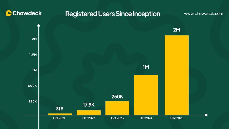 Nigerian food delivery platform Chowdeck hit a major milestone, surpassing two million users. The latest development comes a year after the startup reached 1 million users on its platform.