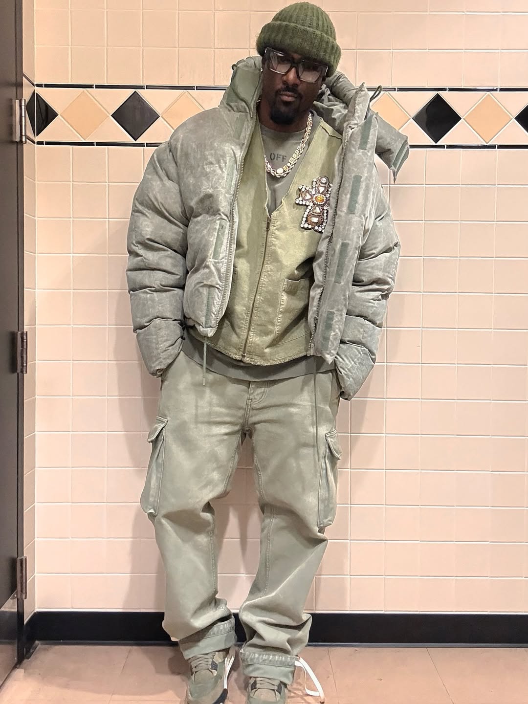 For a more relaxed take, a monotone green street-style outfit offers comfort without sacrificing style. A green puffer jacket creates a modern silhouette, especially when paired with matching cargo pants. Finish the look with a beanie in a similar shade to keep everything cohesive. The result is an urban, functional outfit perfect for everyday holiday wear.