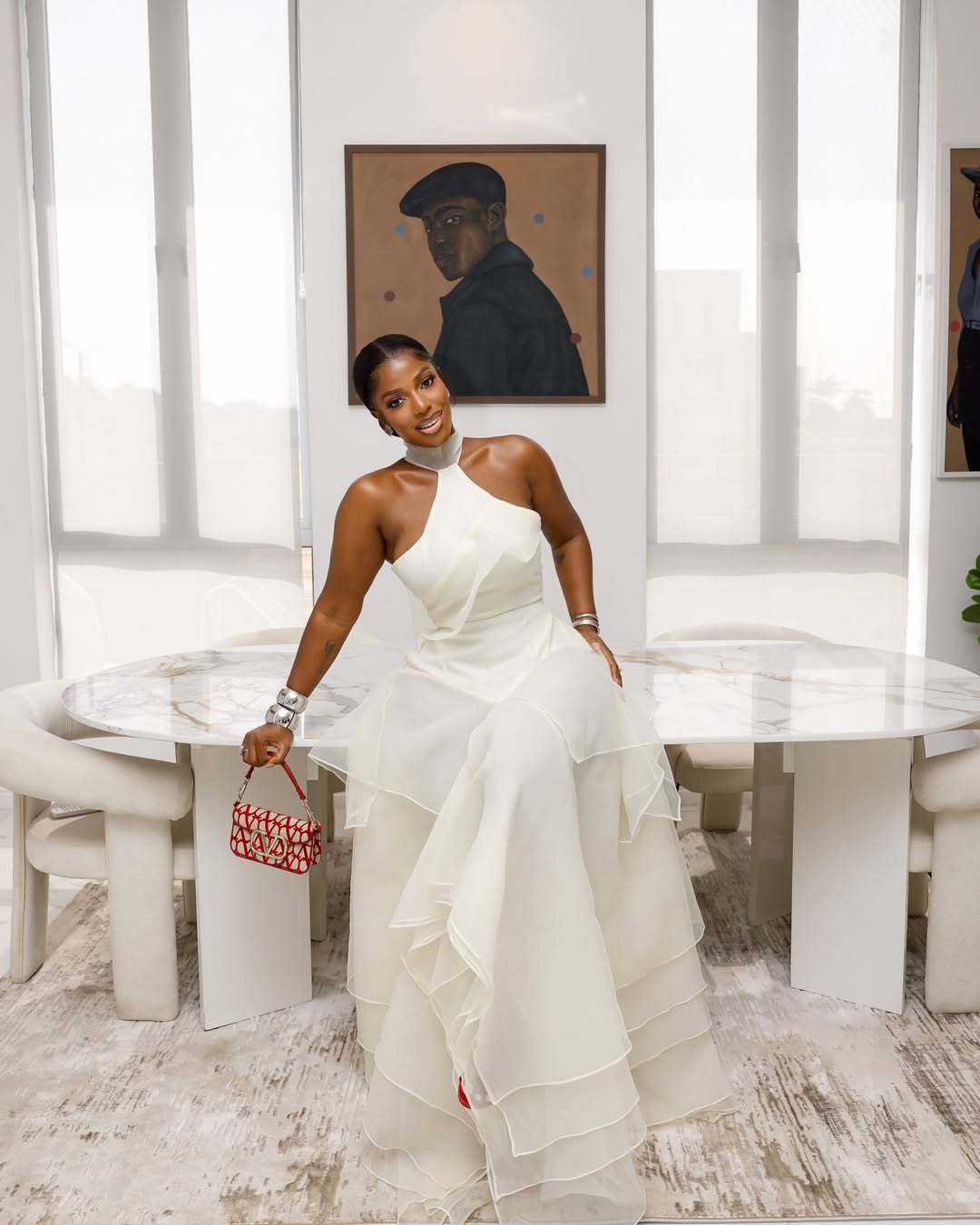 Hilda Baci delivered a breath of fresh air in an Ejiro Amos Tafiri gown that felt light, feminine, and effortlessly chic. Featuring a halter neckline and layers of flowing chiffon, the dress moved beautifully with every step. The soft white color enhanced the delicate silhouette, while a red handbag added a bold, unexpected contrast. This was clean, modern elegance—exactly the kind of look minimalists dream of.