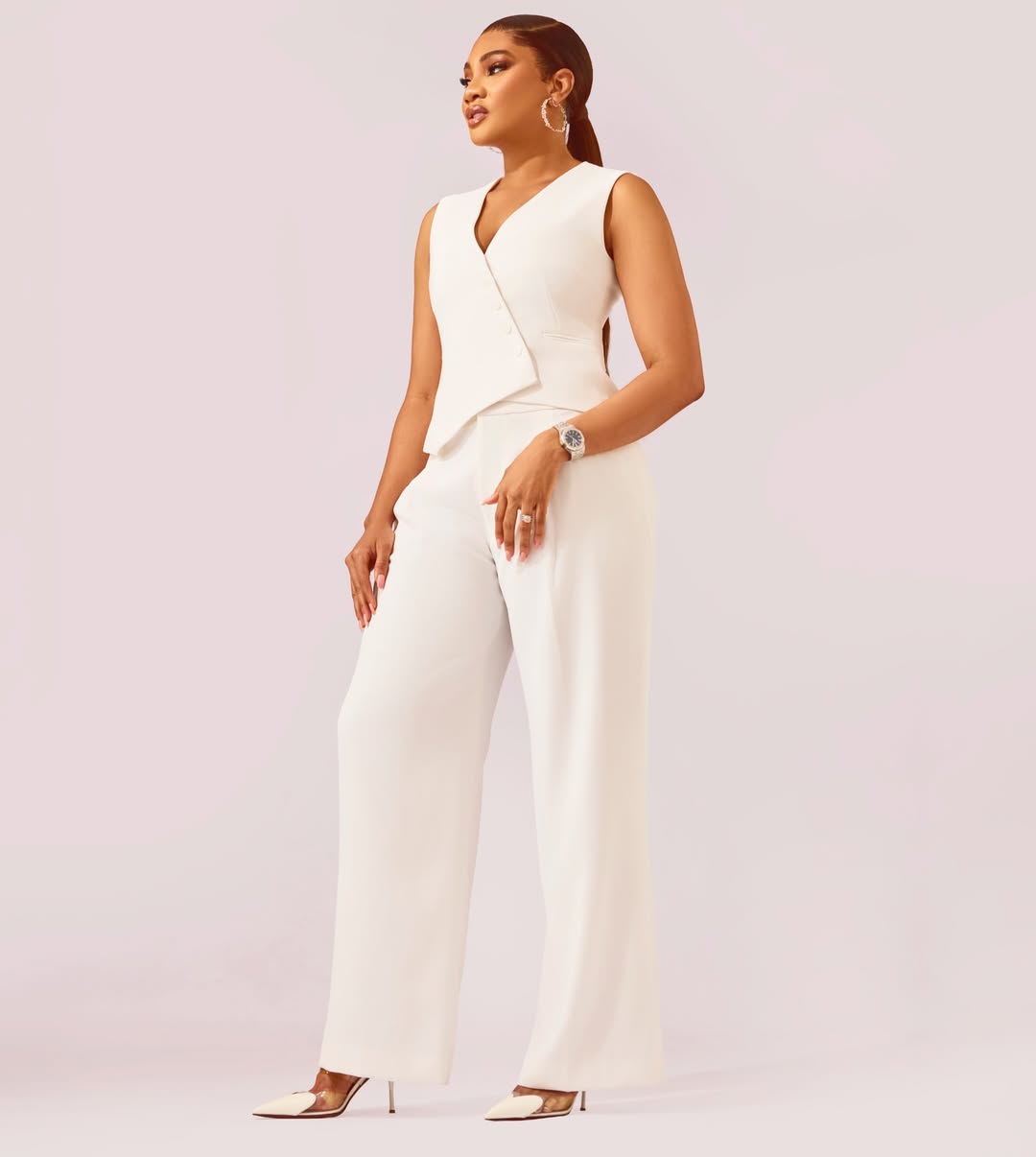 Celebrating her birthday, Nnenna Okoye opted for a sleek white jumpsuit that proved simplicity can still make a statement. The tailored V-neck bodice brought structure, while the wide-leg trousers added ease and movement. Her styling was clean and intentional: gold hoop earrings, a watch, and white pumps that complemented rather than competed. The entire look felt quietly elegant and effortlessly refined.
