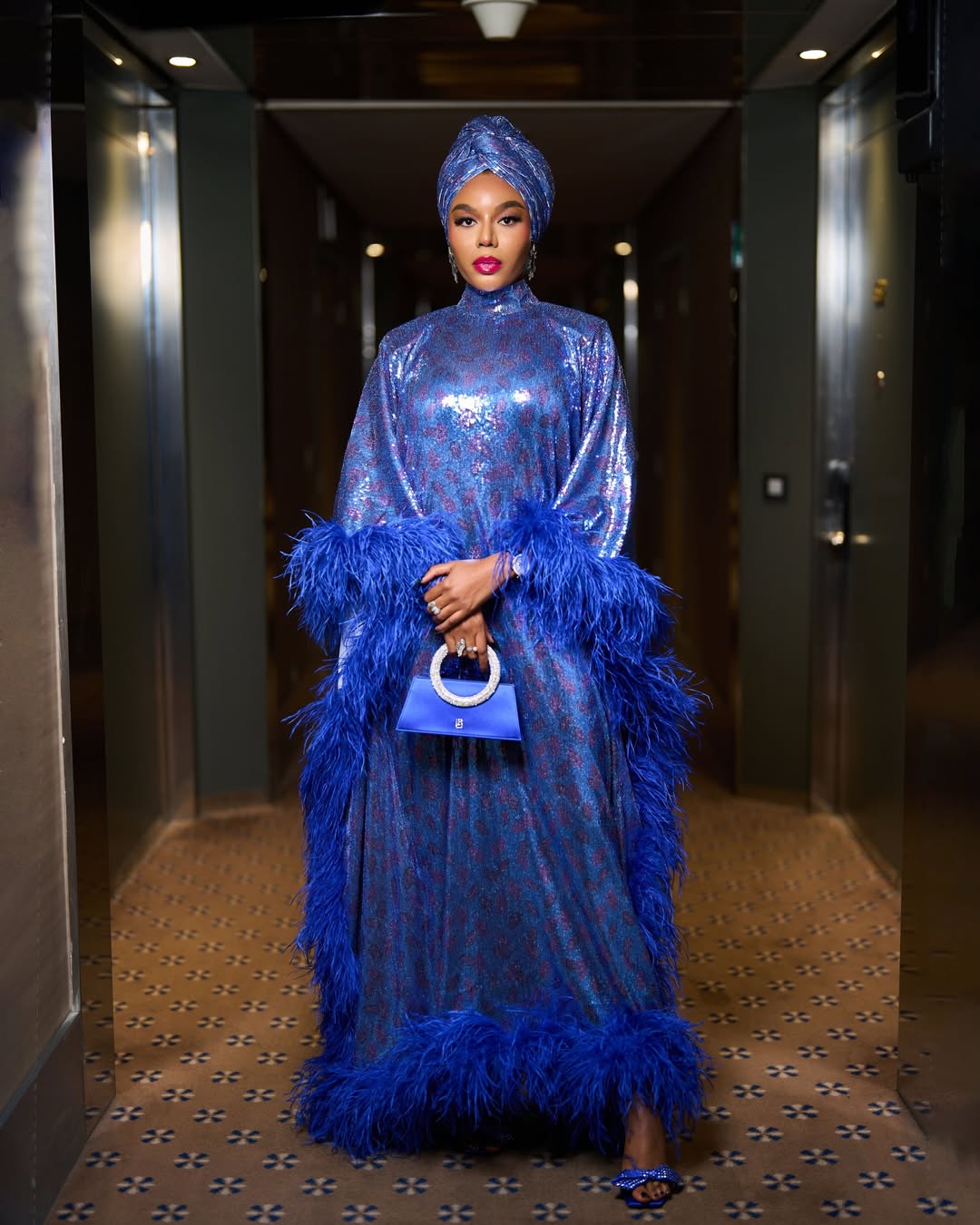 Nancy Isime owned the spotlight at Senator Jarigbe’s 55th birthday celebration in a monochromatic Wanni Fuga ensemble. The deep blue fabric shimmered with intricate patterns, instantly catching the eye, while feathered details along the sleeves and hem brought unapologetic drama. Paired with a matching turban and bold, crystal-encrusted accessories, the look radiated confidence. And that red lip? The perfect fierce finishing touch.